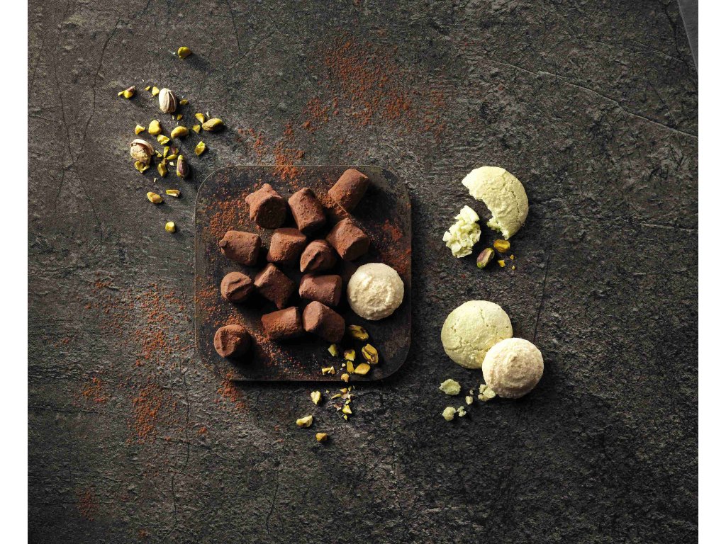Krémové a jemně křupavé čokoládové pistáciové lanýže se štědrou posypkou vynikajícího hořkosladkého kakaa.
